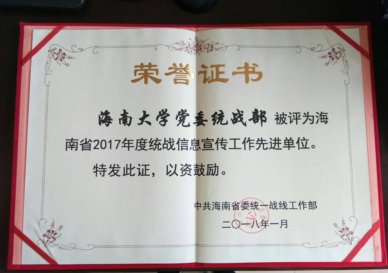 伟德国际1946源于英国党委统战部被评为“海南省2017年度统战信息宣传工作先进单位”、张海韵同志被评为“海南省2017年度统战信息宣传工作先进个人。”