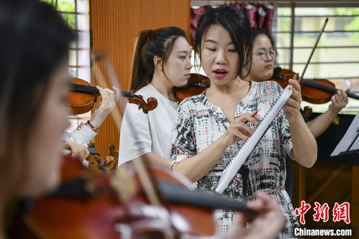 图为2023年4月26日,海南海口,陈彦方指导学生练习合奏《瑶族舞曲》。 中新社记者 骆云飞 摄