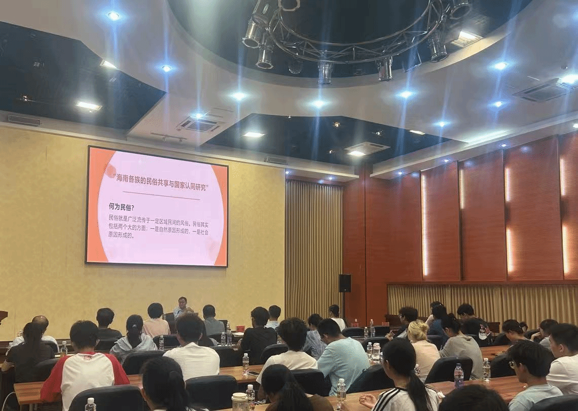 马荣江表示海南民俗形成过程中有融合与有冲突,在长期共生、共存中,各种民俗既相互冲突、摩擦,又包容、融合,再到接受、认同,于是在各族群中形成了许多共性的民俗,民俗逐渐相似或相近,和谐因素逐渐增强,这就是民俗共享。铸牢中华民族共同体意识是新时代党的民族工作的主线,也是民族地区各项工作的主线,讲座通过民俗共享来探究国家认同实现的基本路径,以服务海南自贸港建设。